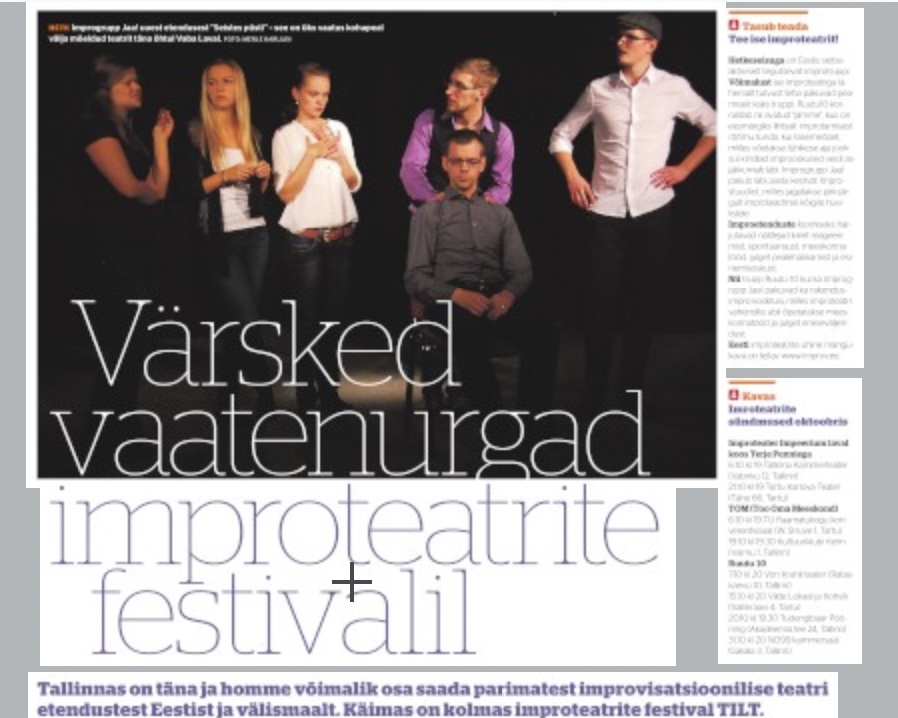 Eesti improteatri näitlejad Erki Aule ja Rauno Kaibiainen näitasid Ringvaate otse-eetris, mida nende etendustel näha saab. Üritusega soovitaksegi improteatrite tegevust laiemalt tutvustada ning festivalil astuvad üles kõik kodumaal tegutsevad improteatrid - Eesti Improteater, Improkraatia, Improgrupp Jaa!. Samuti on külas teatrid Soomest, Lätist, Norrast ja Inglismaalt. loe edasi